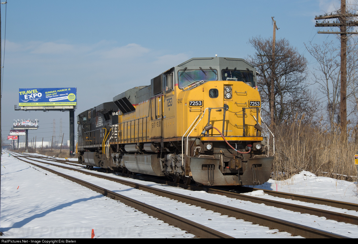 | One of the 100 former UP SD9043MAC units NS has purchased from EMD/Progress Rail. These units were bought to help alleviate the power shortage and will eventually be rebuilt into SD70ACe specs. NS chose not to go with the UP designation on these engines. Rather they went with the SD90MAC name. This unit trailed on 64E. |