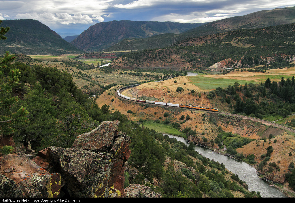 Union Pacific MRONY heads eastbound out of Radium, Colorado, and is about to enter Little Gore Canyon on the afternoon of August 4, 2014. EMD locomotives powering the train are a pair of SD70Ms (Nos. 4875 and 4964) bracketing older SD60 No. 2160.