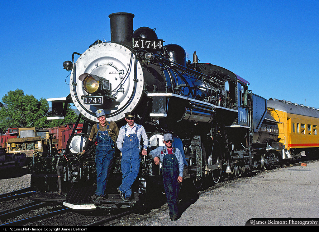 Heber Creeper crew members (left to right) George Connell, Engineer, Eric Dowty, Conductor and Mike Bigler, Fireman pose for the camera at Heber City yard on Aug. 27, 1989. Southern Pacific 2-6-0 No. 1744 was built by Baldwin Locomotive Works for the SP in Nov. 1901.