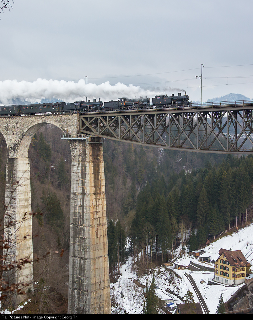 In triple traction of Eb 3/5 # 5819, A 3/5 # 705 and B 3/4 # 1367 over the highest railway viaduct of Switzerland, the 99 meter high and 366 meter long Sitter viaduct near St.Gallen. This is the former Bodensee-Toggenburg-Bahn line St.Gallen-Wattwil, now Südostbahn (SOB).