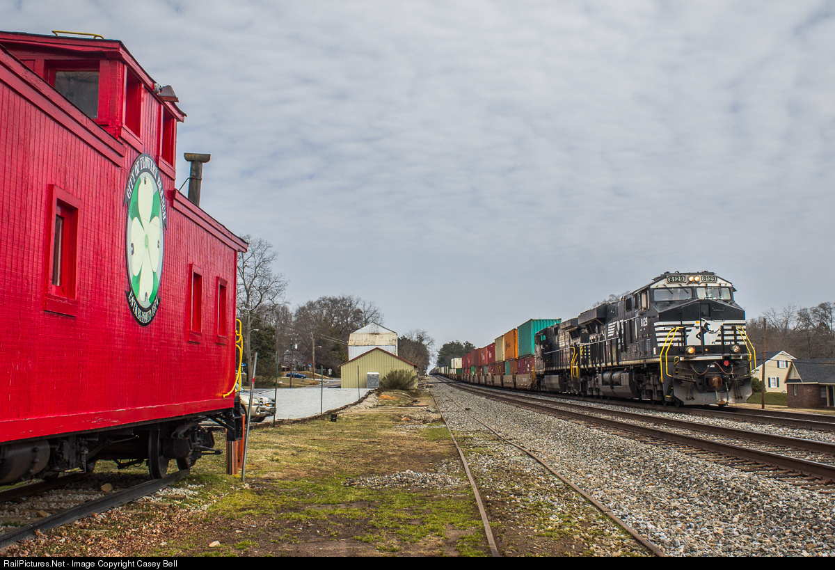 | After a fresh meet with 204, NS train 221 with an ES44AC dragging the 1.5 mile train through downtown Flowery Branch on its way to Inman yard to drop off the Charlotte container traffic. |