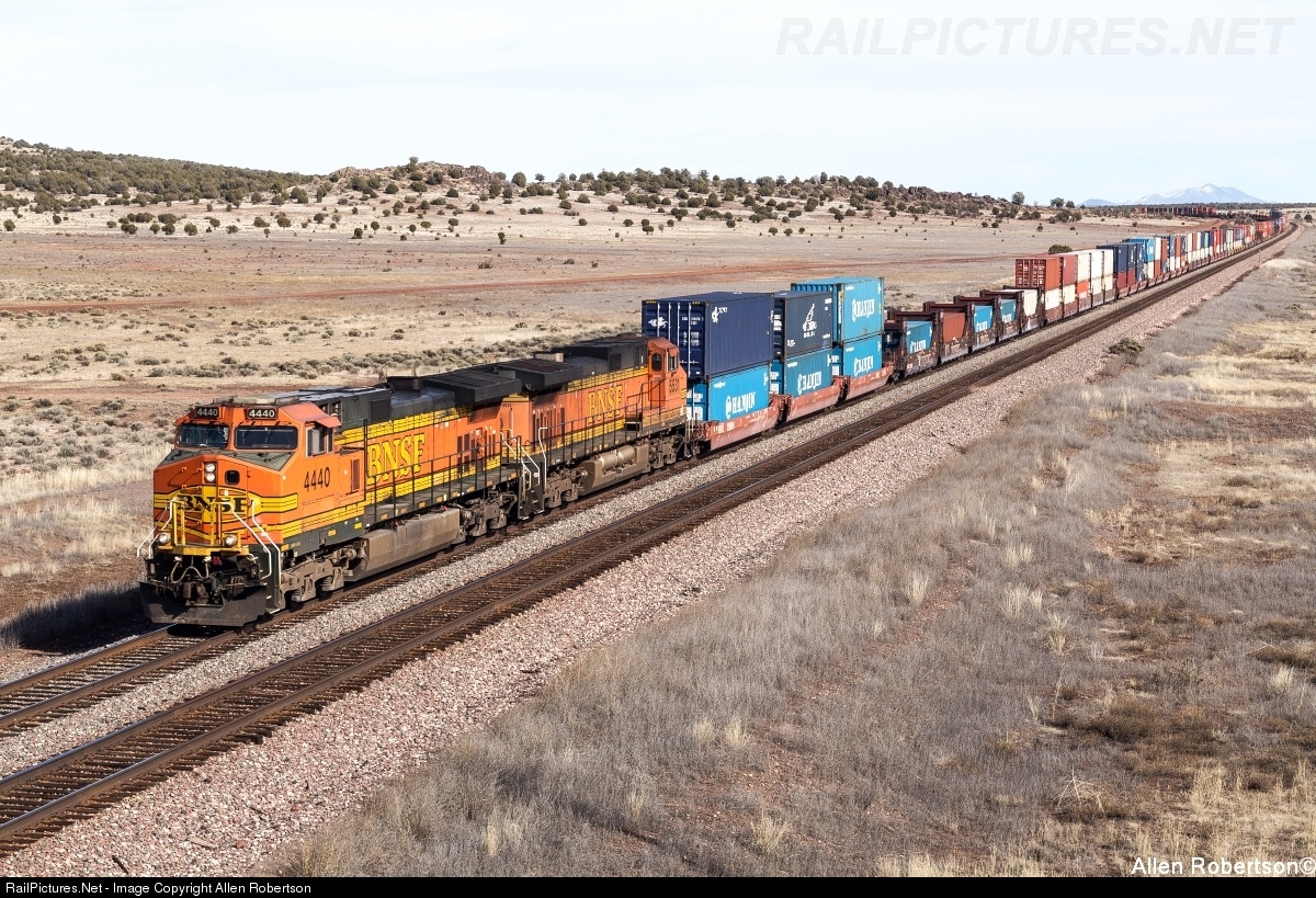 | BNSF 4440 & 5531, both in Heritage II paint, lead a westbound stack train that is about to pass under historic Route 66. I think this is part of the 1960 realignment know as the Crookton Cutoff. |