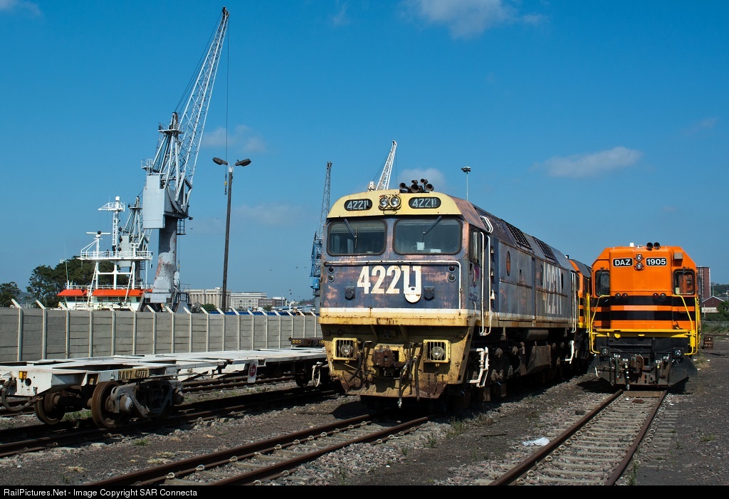 Still in Durban at the moment are the four 422 Class Clyde / EMD J26C (Standard Gauge) locomotives, with 42211 in view, and the five DA Class Clyde / EMD G26C locomotives, with DAZ 1905 in view (others are DAZ 1902 / DAZ 1904 / DAZ 1903 / DAZ 1906) as well as the container flat wagons. They were part of a total of 23 locomotives of various Class / Types (all diesel), that arrived in Durban, South Africa, from Fremantle in Western Australia aboard the “Fairlift” on the 26th January 2015. It is believed that the container flats and the five DA Class locomotives will be reloaded onto another ship soon – destination possibly another African country? The four standard guage 422 Class Clyde / EMD J26C locomotives will probably be stripped of their useable parts and then scrapped in Durban. They are standing on 3'6" (Cape Gauge) pony bogies at the moment.