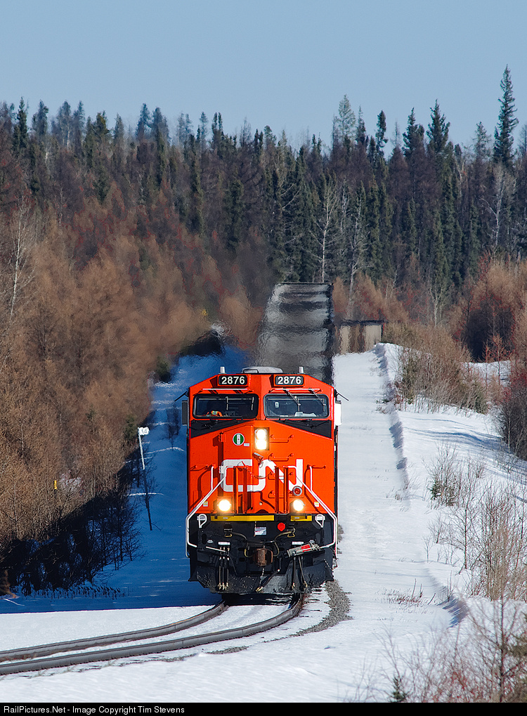 | 112 coal empties for Coal Valley negotiate the rollercoaster Foothills Sub. New CN ES44ACs 2876, 2914 and 2899 (on the rear) provide the power. While all 3 units certainly aren't needed for the westward trip, they'll definitely be in use lugging the loads back east. |