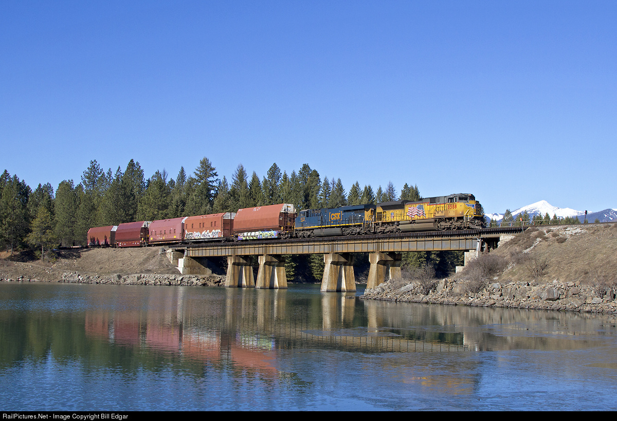 UP 8588 and a CSX mate rush a Boeing train of empty equipment east on Montana Rail Link at MP 55, Trout Creek, MT. Business is good at Boeing and "Boeing specials" are not uncommon on this route, although the power is a bit unusual. these trains operate in both directions between Wichita, KS and Renton, WA.