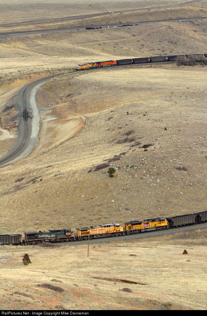 As the head end of an eastbound Union Pacific coal train traverses Big 10 Curve in the background, the mid-train DPUs leave Eisele (formerly Clay) in the foreground. Two other tracks can also be seen in the background, Rocky Spur and the main line and siding at Rocky, where this train will be in a few minutes.