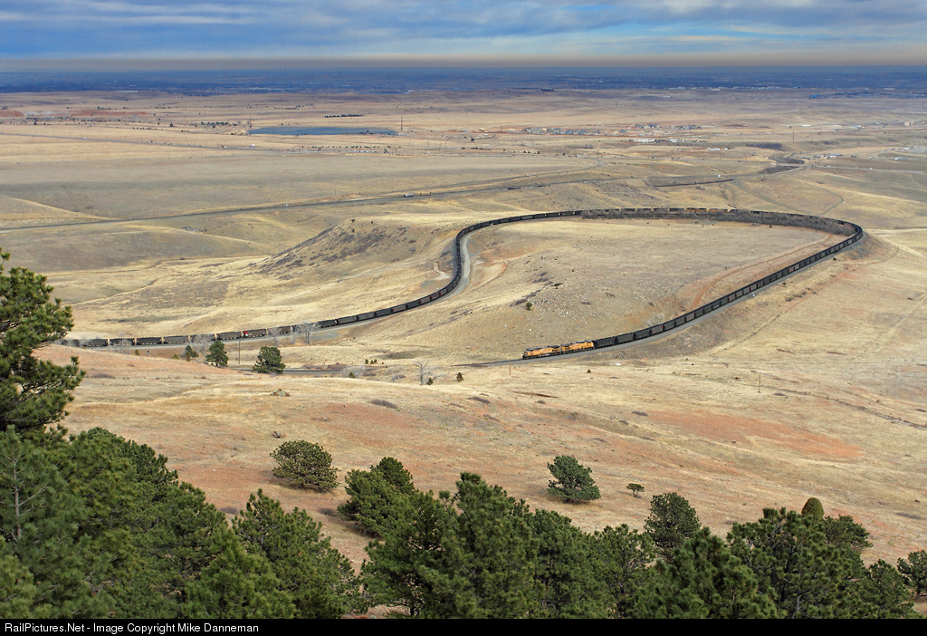 An eastbound Union Pacific coal train traverses Big 10 Curve at Eisele (formerly Clay), Colorado, on February 14, 2015. The head end of the train is already out of sight on the left and approaching the west switch at Rocky. The mid-train DPUs of the heavy train are in the middle of Big 10 Curve, while two AC4400CWs hold down the rear in the foreground.
