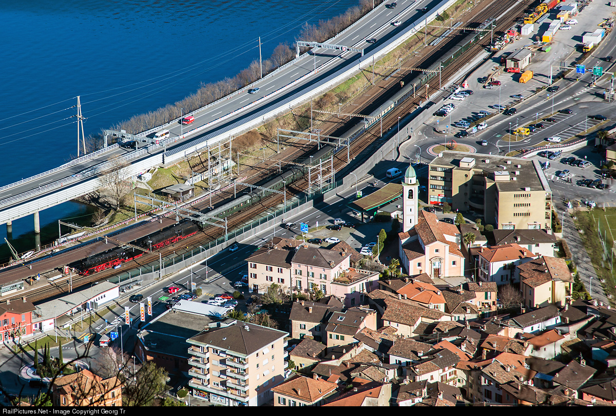 | Seen from high above the mountain near the village of Carona, a steam train with former german locomotives 01 202 and 01 1066 just crossed the Lake of Lugano on the dam of Melide, with the train from Mendrisio to Locarno. In the rear of the train is electrolocomotive Ae 6/6 # 11407 "Aargau" of association Mikado 1244. |