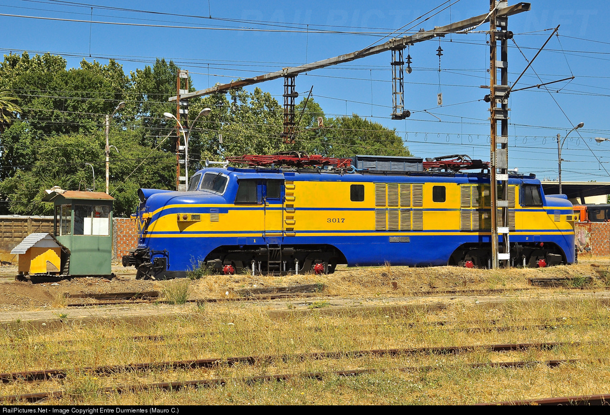 E-3017 electric locomotive of italian origin (Gruppo Azziende Italiane), belonging to state railways of Chile (EFE) and currently working for TECDRA (railway maintenance), stopped waiting for departure from Chillán. Are electric locomotives type "E-30", were built especially for the railroads of Chile by the Italian consortium "Gruppo Aziende Italiane (G.A.I.)" in Milan - Italy. They were 22 locomotives in operation since 1961 for "FFCC del E". Currently there are only two locomotives (E-3017 and E-3020) operated by EFE for various purposes.