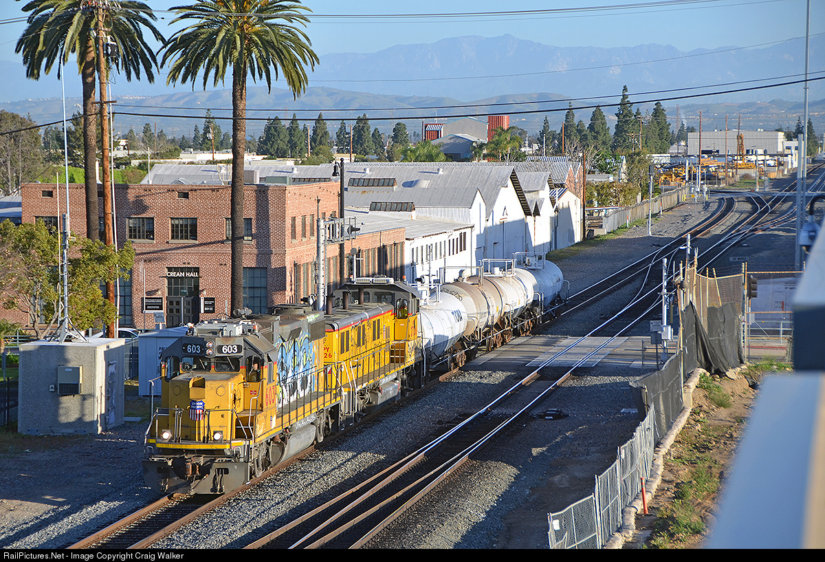 Union Pacific train LOA31R (a local headed from Anaheim to Santa Ana) exercises trackage rights on the Metrolink-owned line through Orange, California, on February 25th, 2015. The train consists of GP38-2 603 (ex-SP 4837), GS21B 2726 and four tank cars (possibly headed to Behr Paint).