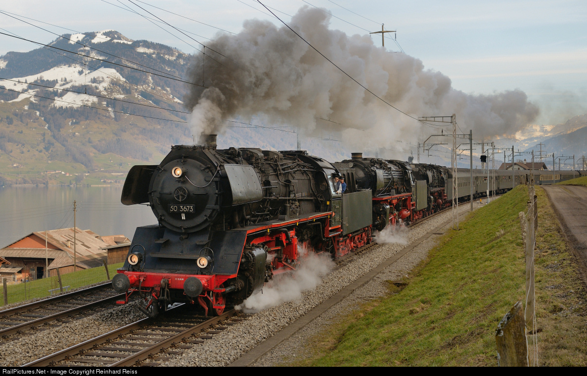 | Triple headed steam train with 50 3673, 01 202 and 01 1066 on the way from Erstfeld to Wohlen. |