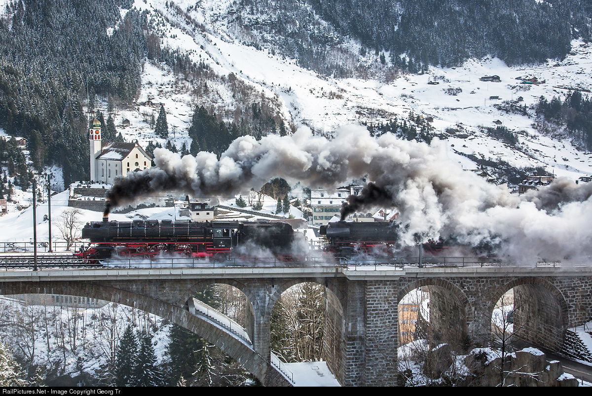 Double traction steamtrain on the northern ascent to the Gotthard tunnel, on a grade of 2.6 %, with the two former Deutsche Bahn "Pacific" 01 202 (Association Pacific 01 202 in Lyss, Switzerland) and 01 1066 (lettered as 012 066) of the Ulmer Eisenbahnfreunde. The train, organized by Eisenbahn Nostalgiereisen Bebra, started in Munich/Germany the day before, reached Switzerland this morning in Schaffhausen and is going to Locarno, crossing the middle Meienreuss bridge in Wassen with the famous church in the background.