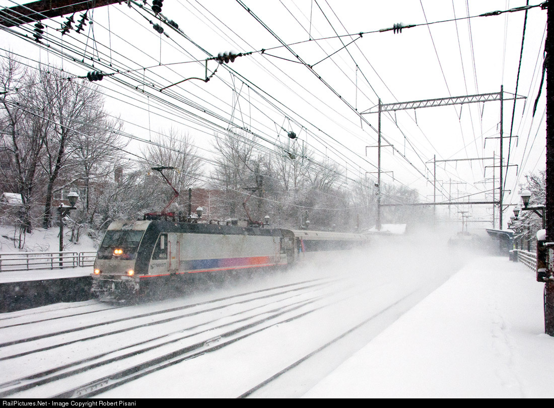 | Two non-stop NJ Transit commuter trains pass through Metuchen at the same time, creating quite a blizzard in the process. Both trains are powered by ALP-46s and both units are following the standard practice of having both pantographs raised during icy weather. NJT 4664 is leading eastbound while the locomotive on the closer track is shoving west. |
