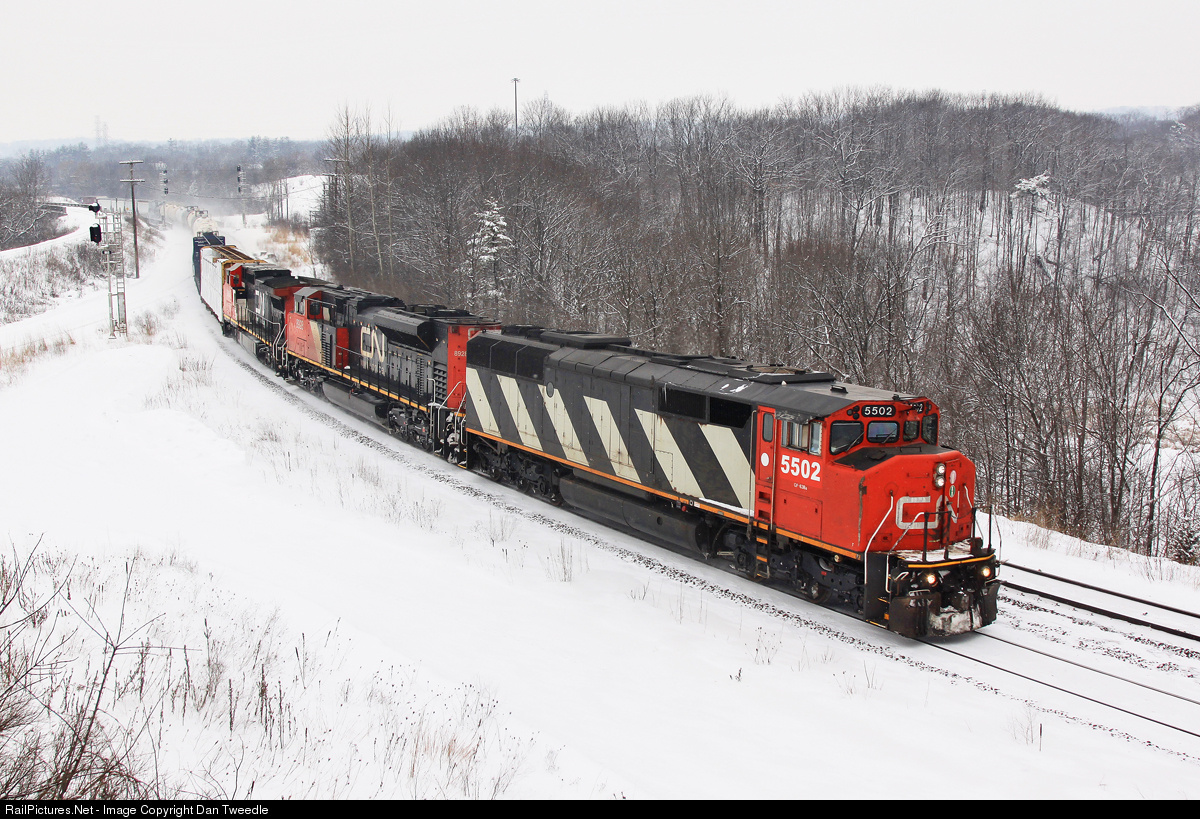 | CN 5502, one of four SD50AFs on the CN roster, leads 332 into Bayview Junction after a few centimetres of new snow. |