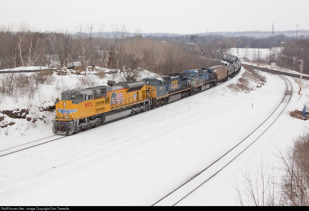 | CP 640-021 with a fresh UP 8972 on the point, and CSXT 7830 and CEFX 1051 trailing, descends the last few miles of the Niagara Escarpment on the northern end of the Hamilton Subdivision. |