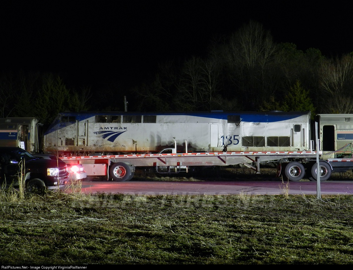 After striking a over-sized truck at a crossing along US 301 in Halifax, NC, Amtrak P080 of March 9th, is seen in the recovery phase while crews work to re-rail the P42 Engine #185. The Engine (Facing South now) and the baggage car are read added to the consist. The Story: Earlier this day a Tractor Trailer pulling an oversized load attempted to cross the grade crossing at Halifax Road, NC. While attempting to cross the grade crossing Amtrak 80 Approached. The train struck the truck derailing the engine and baggage car. The Engine landed laying across the tracks. Thankfully, the Engineer emerged unharmed.