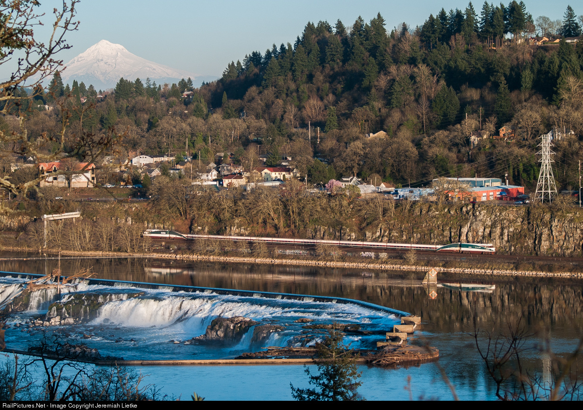 As the day comes to an end at Willamette Falls, an Amtrak Cascades races down the Brooklyn Subdivision alongside the Willamette River headed for Eugene.