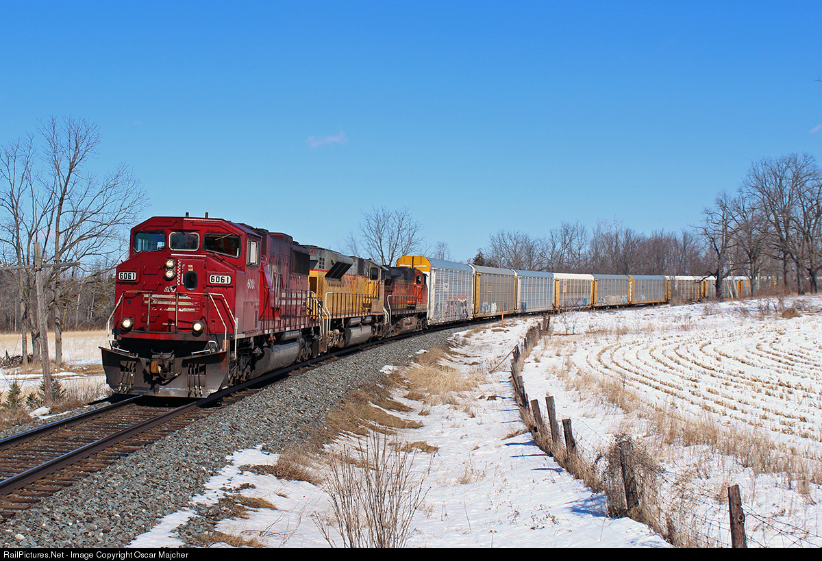 SOO 6061 rounds a curve on the countryside in Puslinch on its trip west leading CP 147. Trailing where UP 3747 & BNSF 4672.