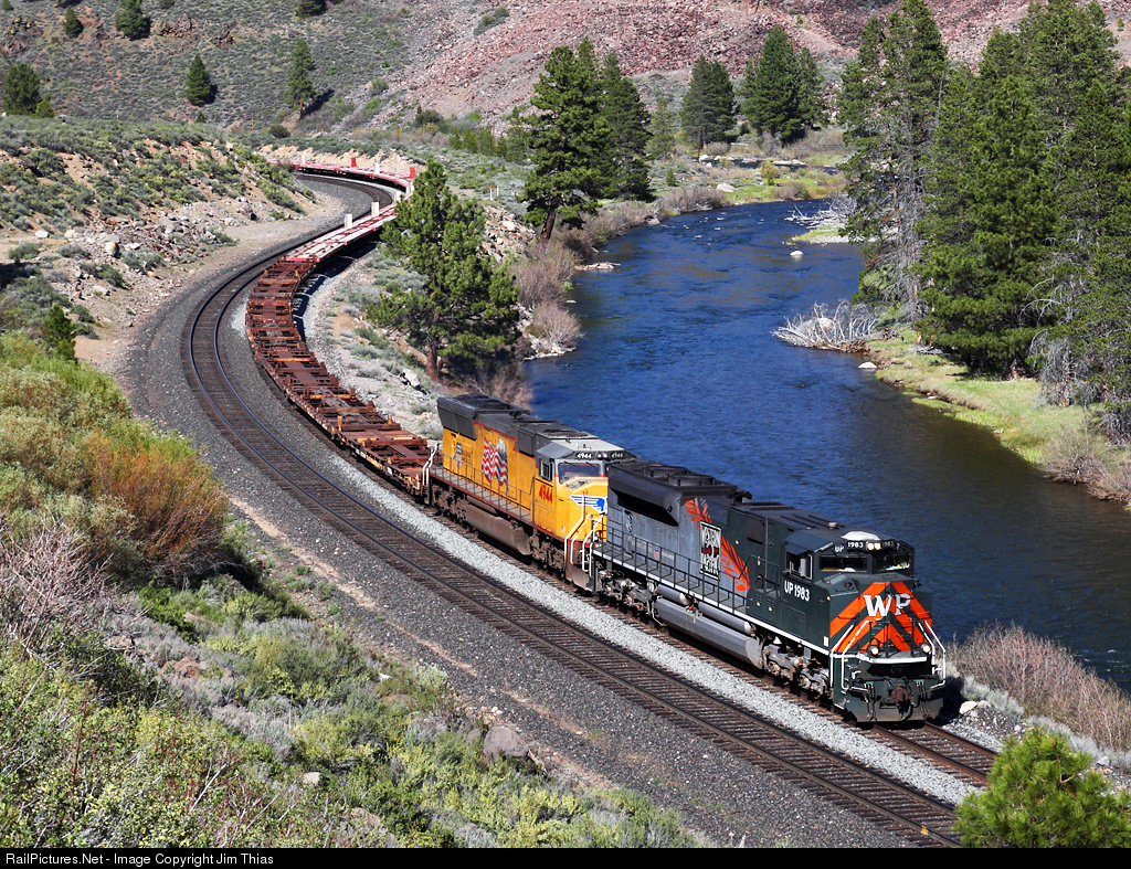 UP 1983 leads a train of 71 DODX flat cars along the Truckee River in Glenshire, CA.