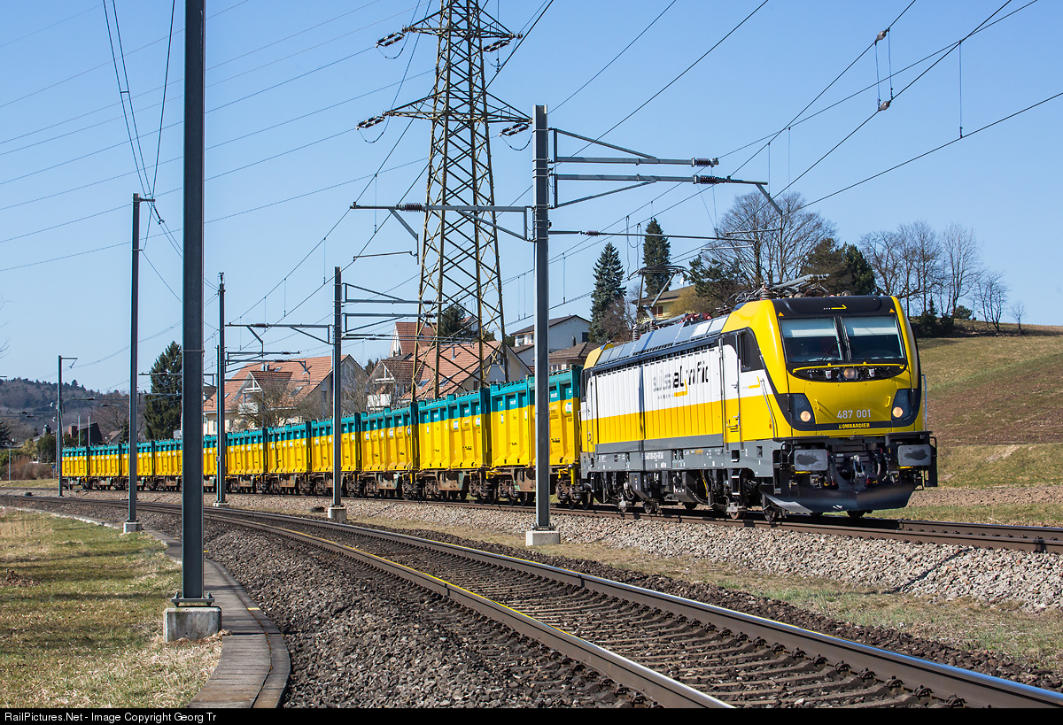| The new Bombardier TRAXX F140 AC3 LM # 487 001 of Swiss Rail traffic with the hazard waste train 69139 from Kölliken to the BAZO in Niederglatt, running through Otelfingen. |