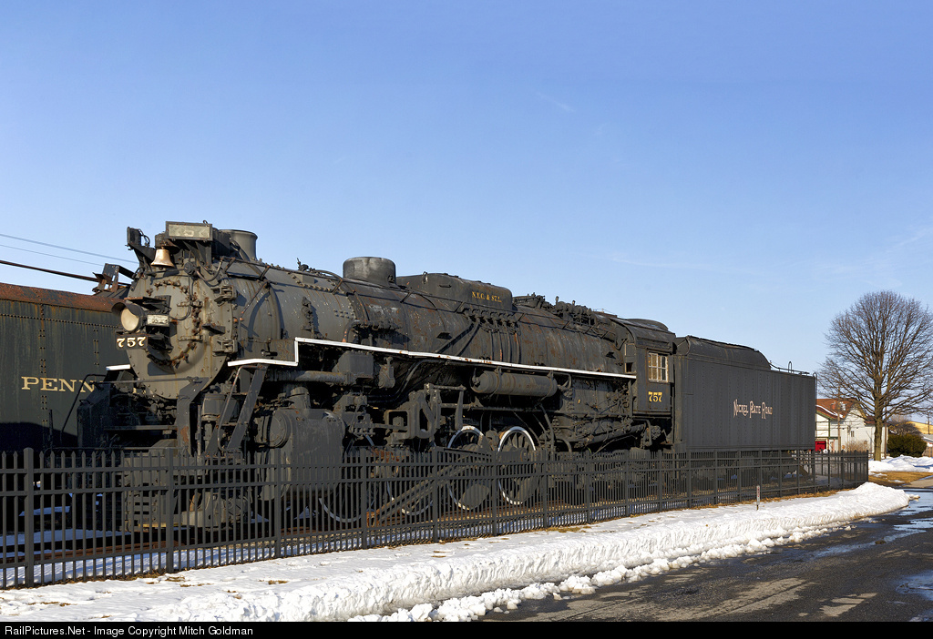 NKP #757 was donated by the Norfolk & Western Railway becoming the Museum's first locomotive in 1966. In October of 2010, the locomotive was moved from the side yard to the front of the Museum. The main rod had to be disconnected for the move as it had seized Fortunately, for all of us, N&W #611 at the VMT was regularity lubricated and moved back and forth while outdoors. It is rather sad the main rod has not since been reattached.