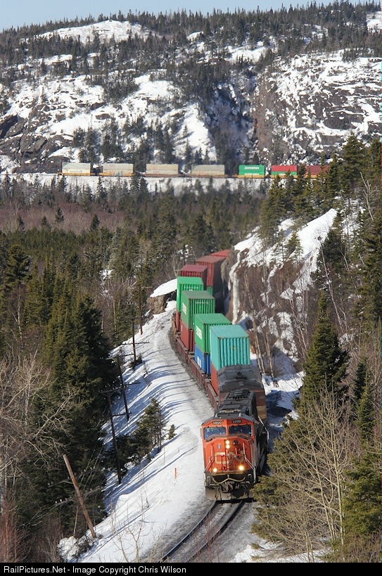 | Due to a major derailment on the CN Ruel Sub, CN has been detouring intermodal trains over the CP. Here we have CN 5800 + BCOL 4603 pulling through Neys with train "CN Q10632 10" running the CP from Thunder Bay to St Cloud. |