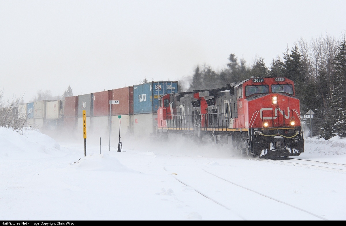 | CN's hottest train detours over CP due to a major derailment on the Ruel Sub at Gogama, ON. CN 2689 + IC 2705 have train Q11131 07, a Toronto to Vancouver intermodal train with 91 platforms well in hand. |