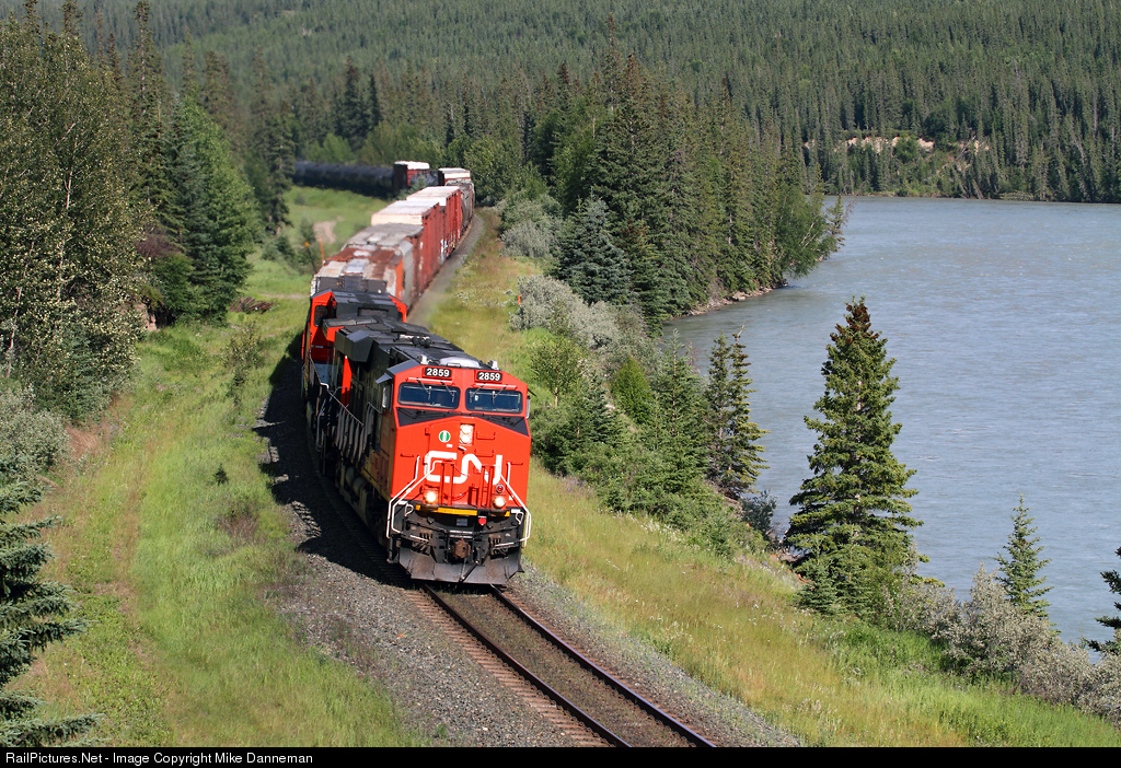 | Canadian National train No. 301 traces the shore of the Athabasca River at Solomon, Alberta, on the afternoon of July 9, 2014. |
