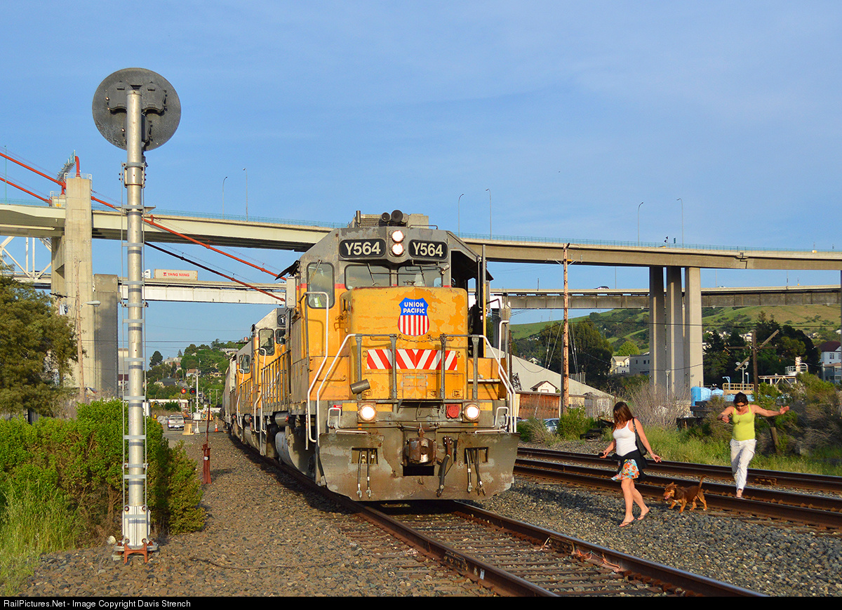 Two Crockett residents participate in their nightly routine of walking down to the waterfront as the "Crockett Rocket" looks on, waiting for an Amtrak commuter train to speed by before taking the main themselves.. |