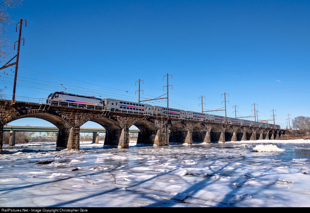 ALP-46 4604, pushing a ten car NJ Transit train, crosses the partially ice covered Delaware River towards Trenton, New Jersey.