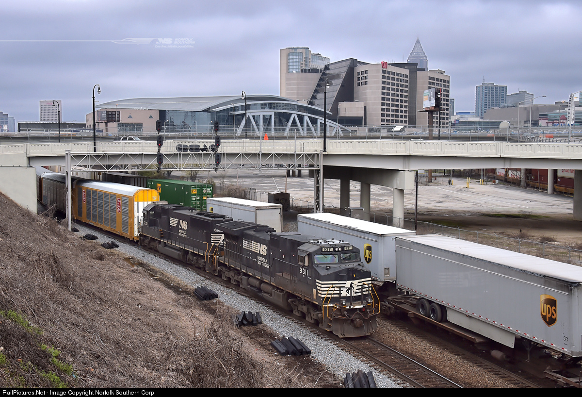 During an overcast late winter's day, rail traffic is steady in downtown Atlanta as vehicle train 26A departs the city, bound for the coastal region of Georgia near Brunswick from Vance, Alabama. Rolling north through town is intermodal train 282 with traffic for Chicago from Florida. Photo by Casey Thomason. For more information about Norfolk Southern, visit www.nscorp.com