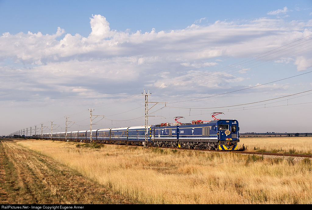 CHINA BLUE....two of Transnet Freight Rail's Chinese class 20E dual voltage 3kV DC / 25kV AC electric locomotives (Zhuzhou Electric Locomotive Co., a subsidiary of the China South Locomotive and Rolling Stock Corporation), have been painted in Blue Train livery for exclusive duty on this luxury train. On their maiden northbound run from Cape Town to Pretoria, the pair are seen with the 19-car train near Regina, between Leeudoringstad and Orkney, on their way to a crew change stop at Klerksdorp. The locomotives were assembled at Transnet Engineering's Koedoespoort works in Pretoria.