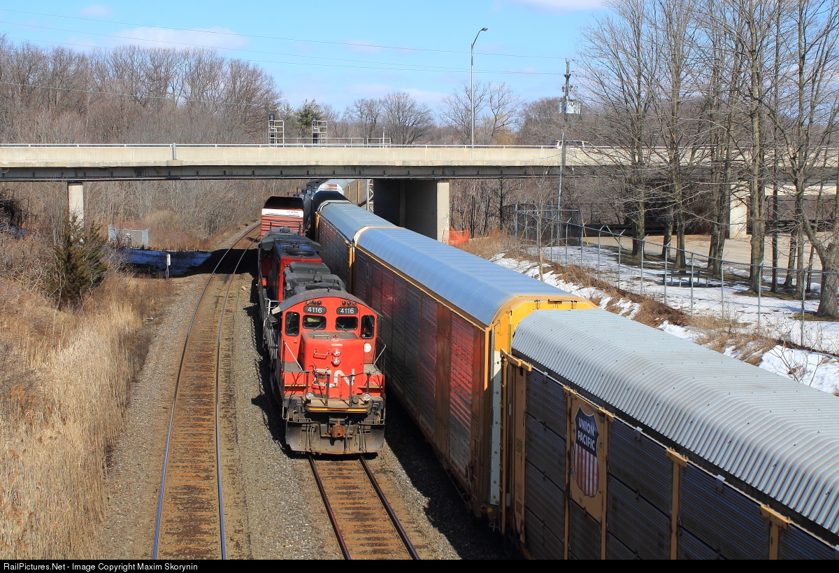 CN GP9RM 4116 is on point of this days 551 which moves cars from Aldershot Yard in Aldershot to Hamilton Yard in Hamilton daily. It is seen here passing by a pedestrian bridge leading to Royal Botanical Gardens on the approach to CN Bayview Junction between the Oakville, Grimsby and Dundas Subdivisions.