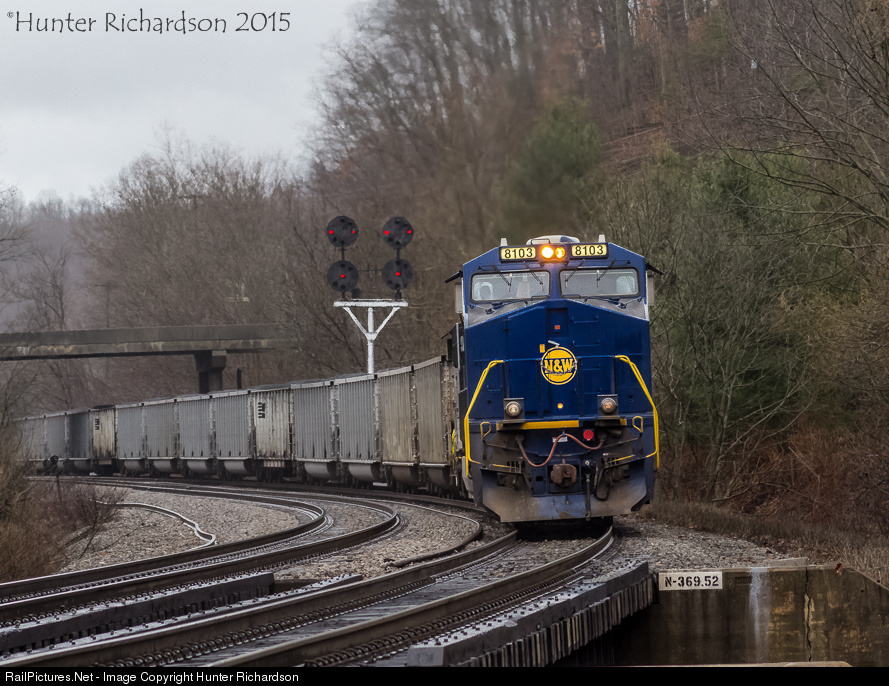 | Shoving hard on the rear of an eastbound loaded coal train, the Norfolk and Western Heritage ES44AC facing west on J5N leans into a curve at Falls Mills, Virginia as it passes under a CPL of it's name sake railroad. |