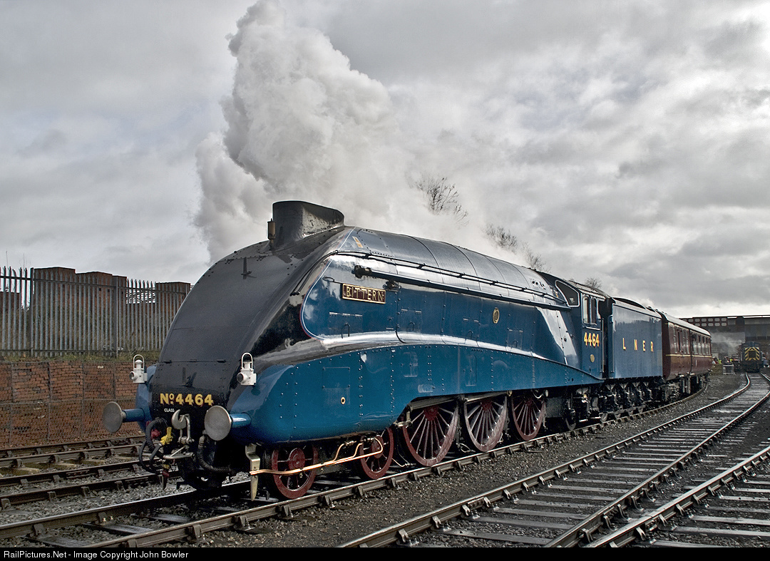 | A4 LNER 4464 'Bittern' on the shuttle service during Barrow Hill's 'East Coast Giants' Weekend which featured temporarily repatriated A4s, LNER 60008 Dwight D Eisenhower from Wisconsin, and LNER 60010 Dominion of Canada from Montreal, to celebrate the 75th Anniversary of the 1938 record breaking speed run by A4 LNER 60022 Mallard.