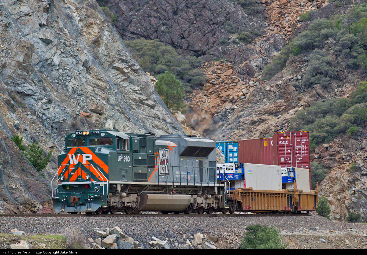 WP in the Feather River Canyon. Well kind of... UP 1983, the Western Pacific heritage unit, winds its way through the jagged rock walls of the Feather River Canyon as it guides a detoured stack train towards Lathrop. Notice the fencing UP has put to keep rocks from falling onto the tracks.