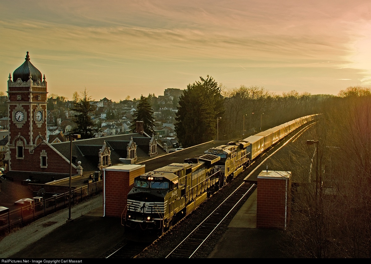 An eastbound roadrailer glides past the Greensburg Amtrak station as the sun makes its way to the horizon in the west. Special thanks to singer/songwriter Michael Bolton for making this picture possible.