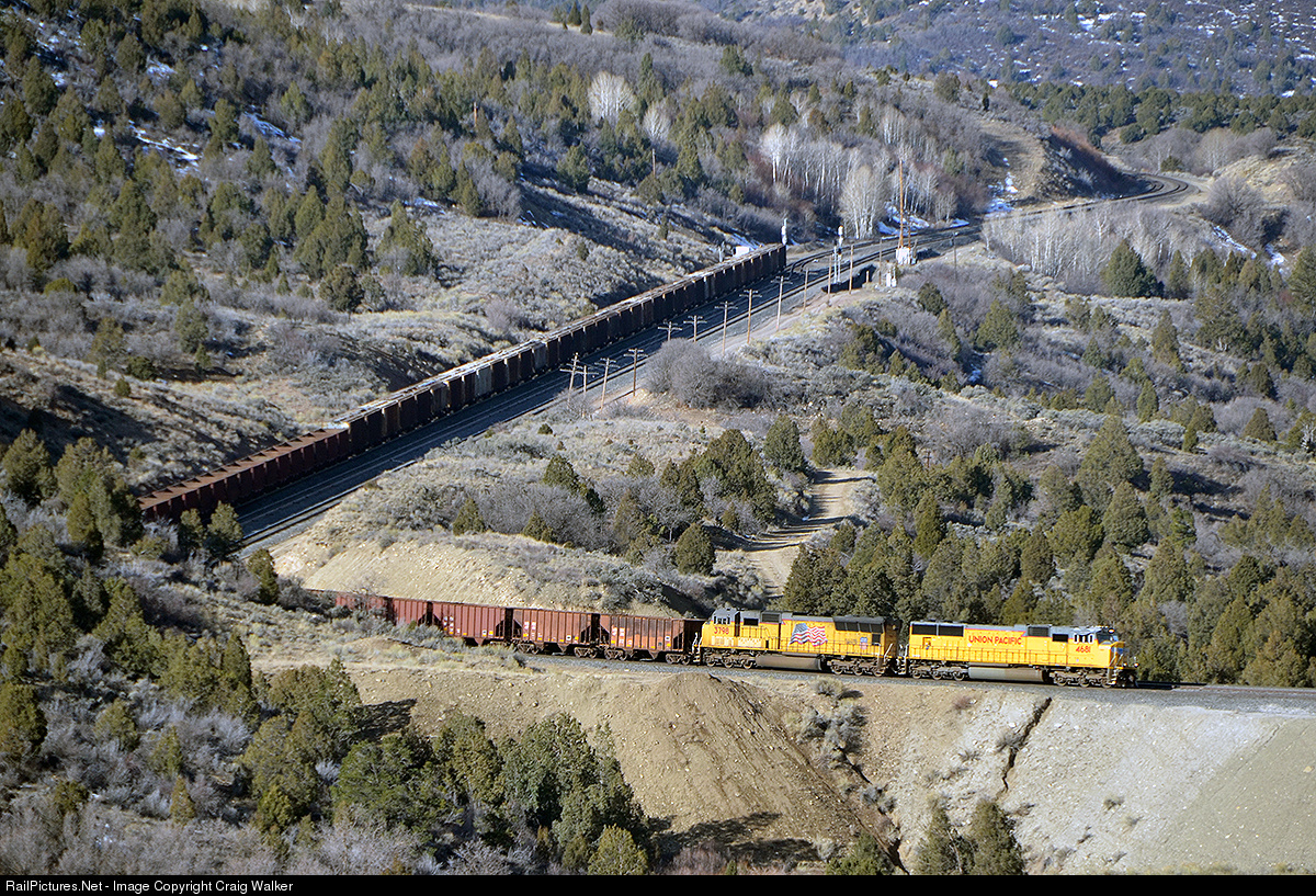 A pair of SD70Ms, 4681 and 3798, bring a salt train, RRLNE (Rock, Rolla CO to Nephi UT, for reloading at Sharp, near Nephi), through the switchbacks at Gilluly, Utah, on March 14, 2015. The power is crossing the Soldier Creek fill. Gilluly is a spot where the tracks wind back and forth enough that one can, without physically moving, see the same train heading right to left and then left to right as they climb the grade.