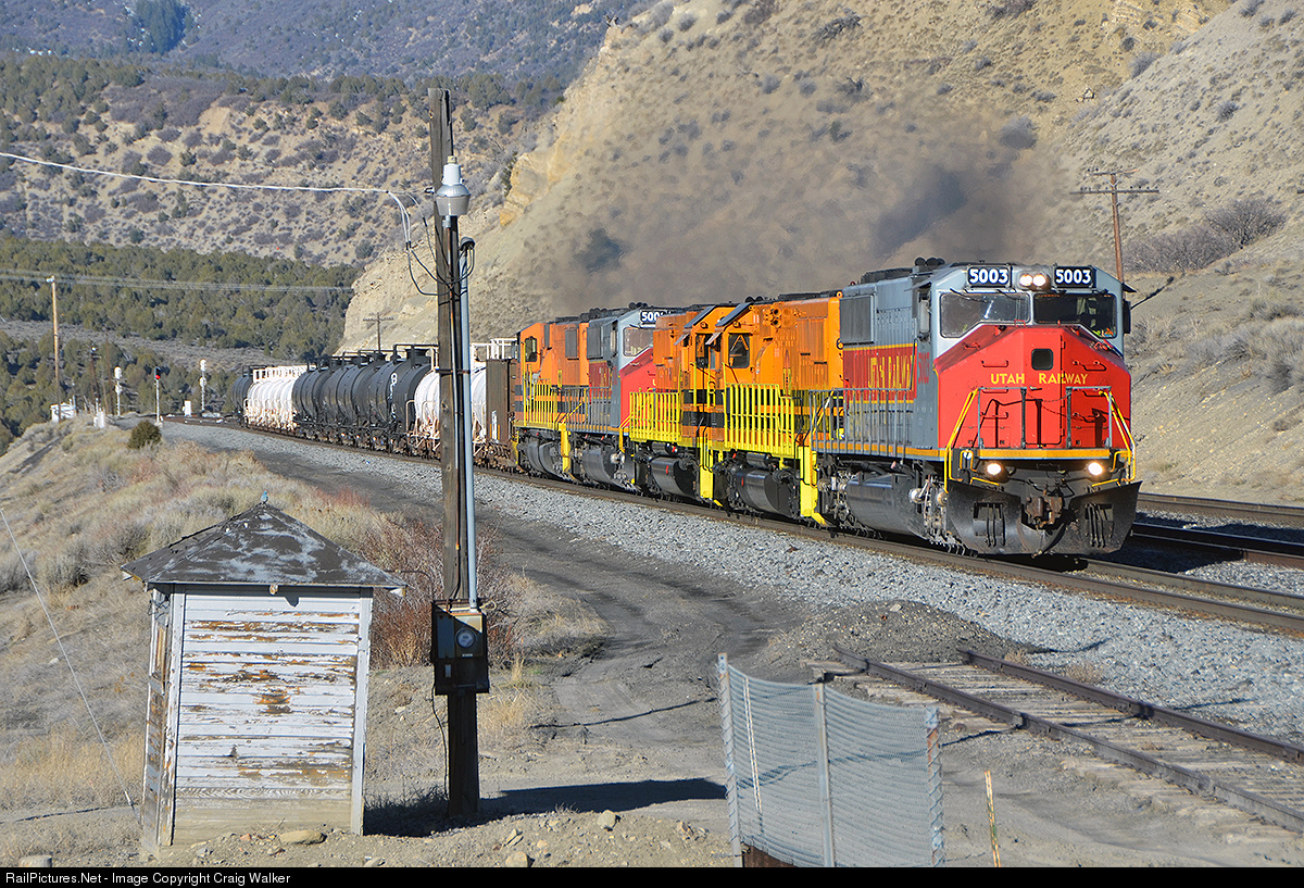 Photographed at "pi" time on Pi Day - Shot on 3/14/15 at 9:26 (3.1415926) ... Well, close enough, anyway, as my camera said it was 9:27 and James Belmont's said 9:26 ... And as I never doubt Mr. Belmont, I'll defer to his camera's clock! Utah Railway MK50-3 5003 leads train HUTAHJ-14 (a buffer hopper car and 22 empty tank cars) eastward from Provo to Helper on March 14th, 2015. The train is passing a relic of the days when telephone booths along the mainline were a common sight before the advent of better radio communications. This old Rio Grande phone booth is, according to the unimpeachable James Belmont, the last of its kind.
