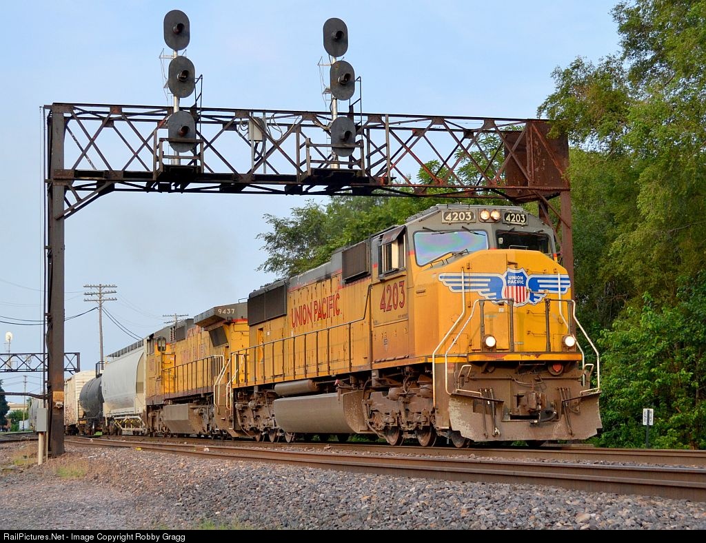 | UP SD70M 4203 leads a manifest west under the classic CNW signals in Rochelle. In March of 2015, work has begun to replace this classic signal bridge with just another generic aluminum cantilever with darth vadar signals. |
