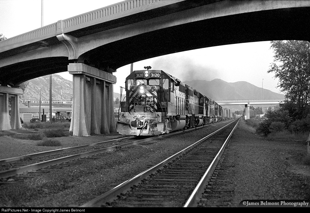 For me, nothing embodies the Denver & Rio Grande Western better than GP40s working a full throttle. A quartet of these EMD pocket hot rods (including an SD7 in transit to Roper) are working at full throttle, ducking under the historic Center Street viaduct at Provo Junction on a warm Aug. 7, 1976 evening.