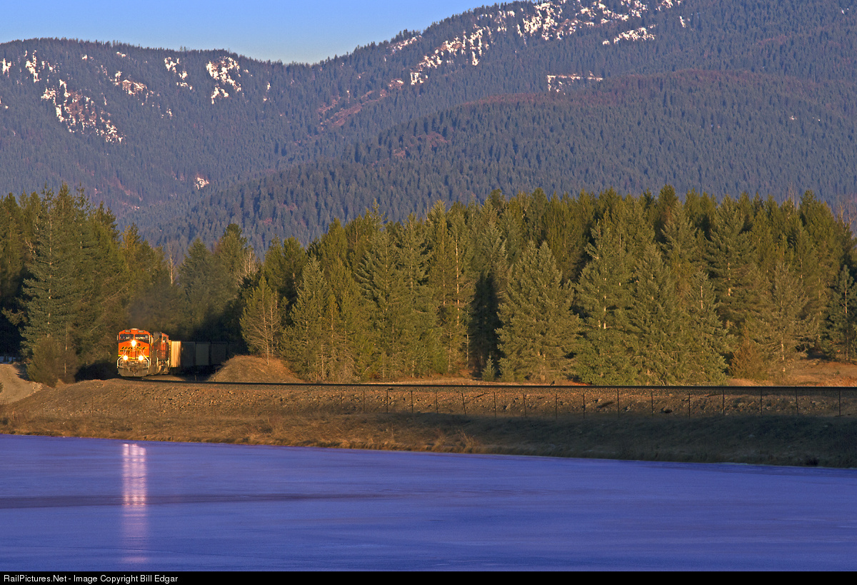| A BNSF coal empty rounds the curve in early morning sun just east of the milepost 57 bridge over the Clark Fork just west of Trout Creek, MT. The headlights are reflecting on the ice covered frog pond, about the only sign of winter here. |