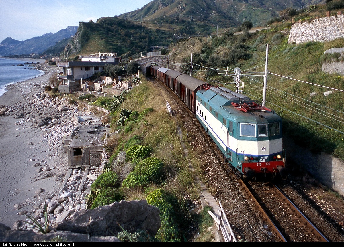 Vintage electric loco 636 274 heads a northbound freight along Sicily`s east coast at Letojanni in 2004.