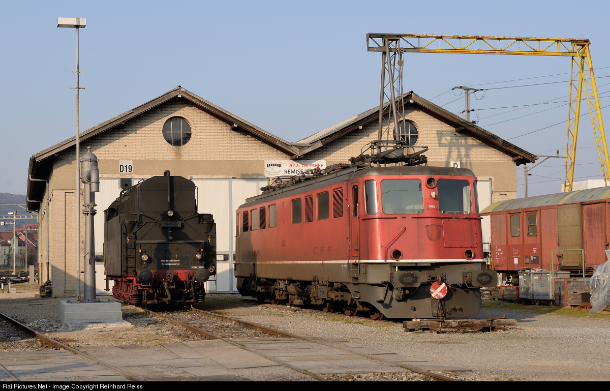 | Due to a loose wheel rim 01 1066 (on the way from Munich to Ticino ) had to leave her additional oil tender in Brugg. On the right Ae 6/6 11455 awaits her end of life after having contributed some spare parts to other locos. |
