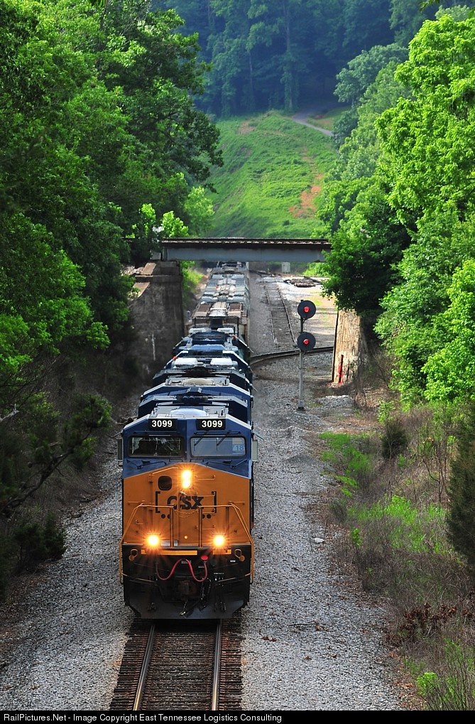 CSXT Train No. Q54031 passes through Dossett in Clinton, Tennessee, as it heads toward its next stop at Corbin, Kentucky. A portion of the train is passing through a tunnel within the hillside seen in the distance. This daily train handles miscellaneous freight moving north between Atlanta, Georgia, and Cincinnati, Ohio, and makes stops to deliver or retrieve rail cars and locomotives from stations along the line, such as Etowah, Knoxville, and Corbin.