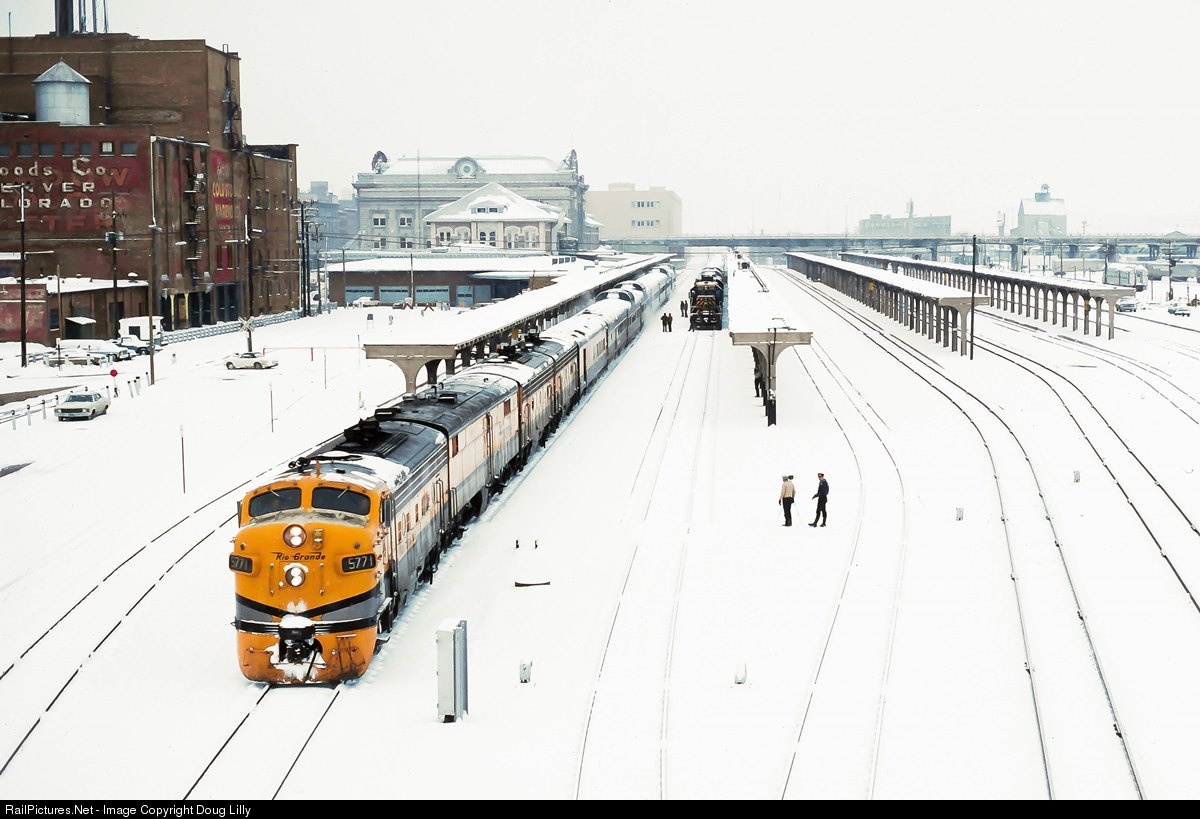 The Rio Grande Zephyr begins its 570-mile westward journey to Salt Lake City promptly at 7:30 on March 19, 1983. Waiting to board on the adjacent track is the Rio Grande Ski Train.