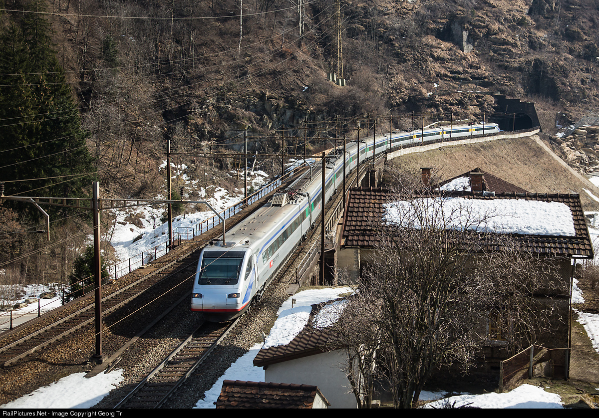 | Highspeed tilting train ETR 470 003 of the SBB is crossing the Polmengo viaduct over the Ticino river near Faido, on the way as Eurocity 12 from Milan to Zürich. The SBB will withdraw the ETR 470 from regular service soon. |