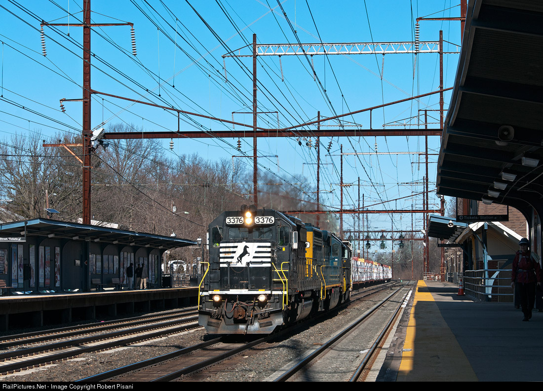 | Three units lead a massive 59-car Conrail ME-32 through Metuchen Station on the Northeast Corridor. The train is in the process of crossing over from track 3 to 2 to 1 to the 0 track at Lincoln interlocking in order to access Metuchen Yard. The power includes NS SD40-2 3376, CSXT SD40-2 8886 (ex-EL SD45-2) and NS GP38-2 5312. A majority of the cars in the consist are loaded center-divider flat cars. After shoving the entire train around the west leg of the wye at Lincoln, the crew would spend the next few hours yarding the train at in Metuchen Yard. |