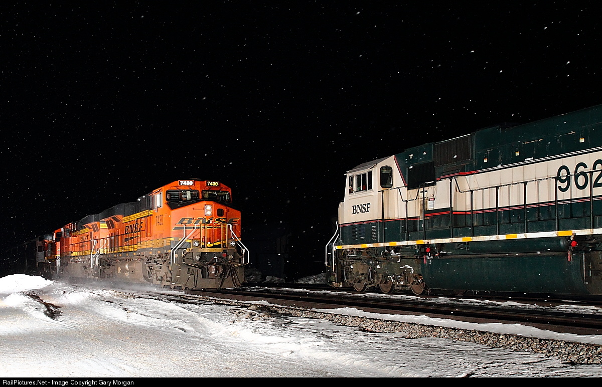 BNSF 7430 meet's BNSF 9929 at Shabbona, IL in a gentile snowfall in the wee hour's of the morning.