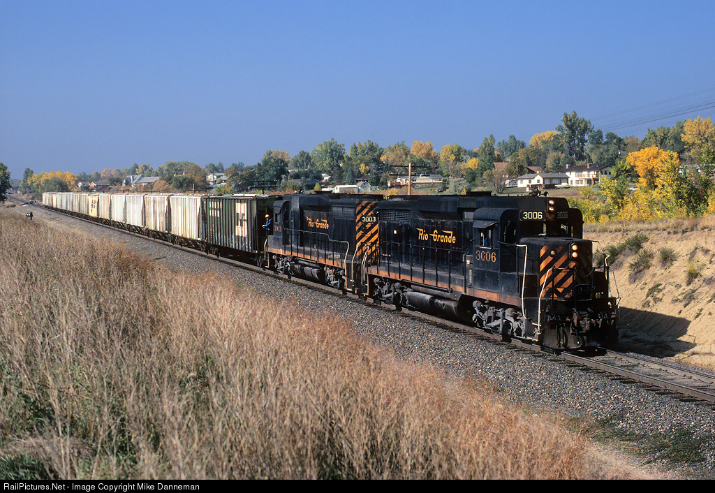 Union Pacific’s West Local drops downgrade through Arvada, Colorado, on October 21, 1997. A pair of Rio Grande GP30s, Nos. 3006 and 3003, power the eastbound train. A carman from North Yard rides 3003 and watches the first covered hopper, which is a bad order car picked up at Leyden and getting hauled back to town.
